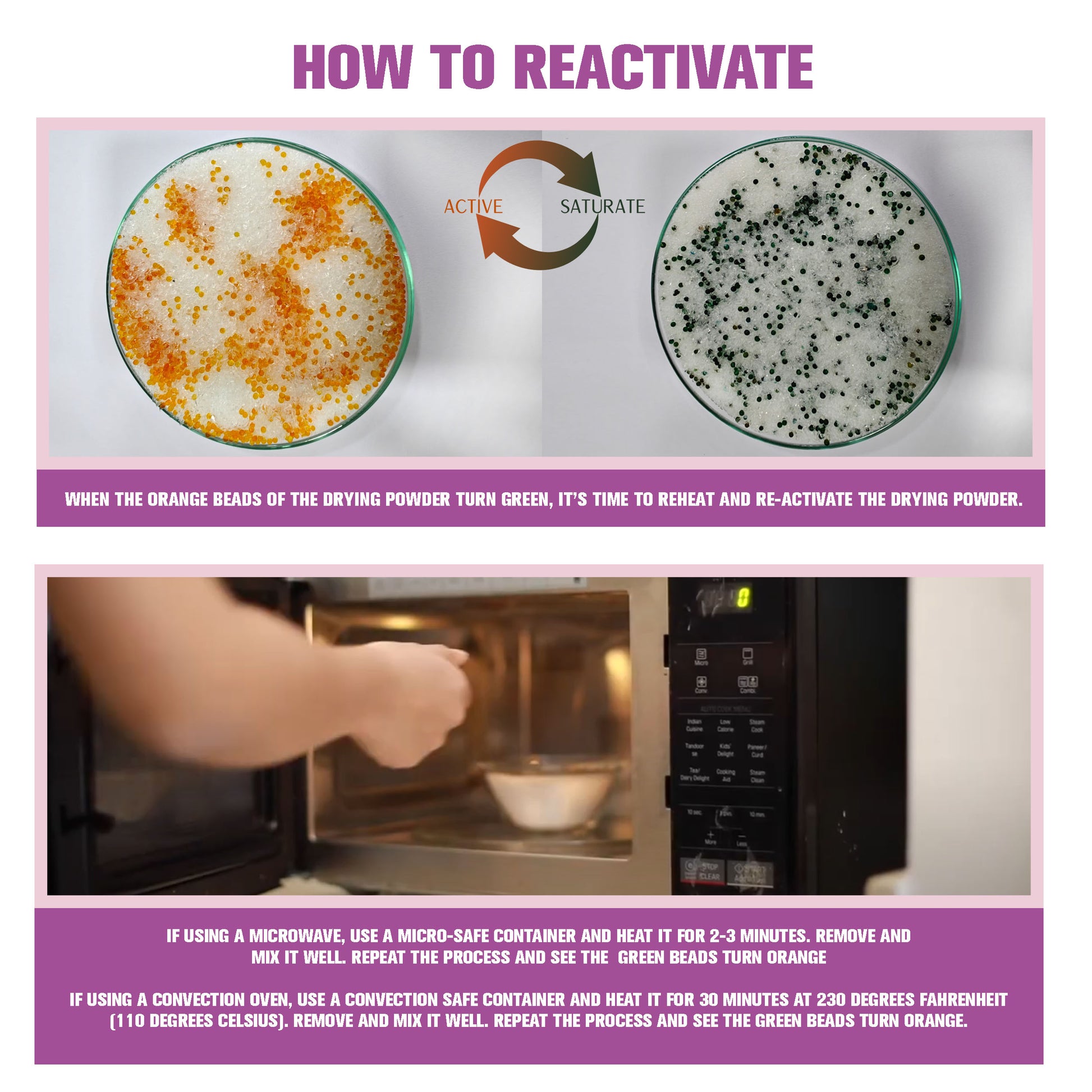 ReusableColor indicating Silica Gel Powder are reusable, once the powder changes color, simply reheat in the microwave. Rechargeable drying powder for flower & plant drying